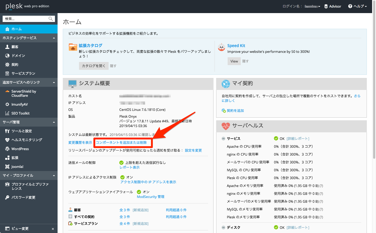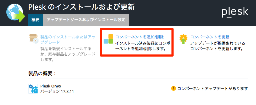 Pleskホーム画面でシステム概要の【コンポーネントを追加または削除】をクリックすると別画面でPleskのインストール画面が表示されます。