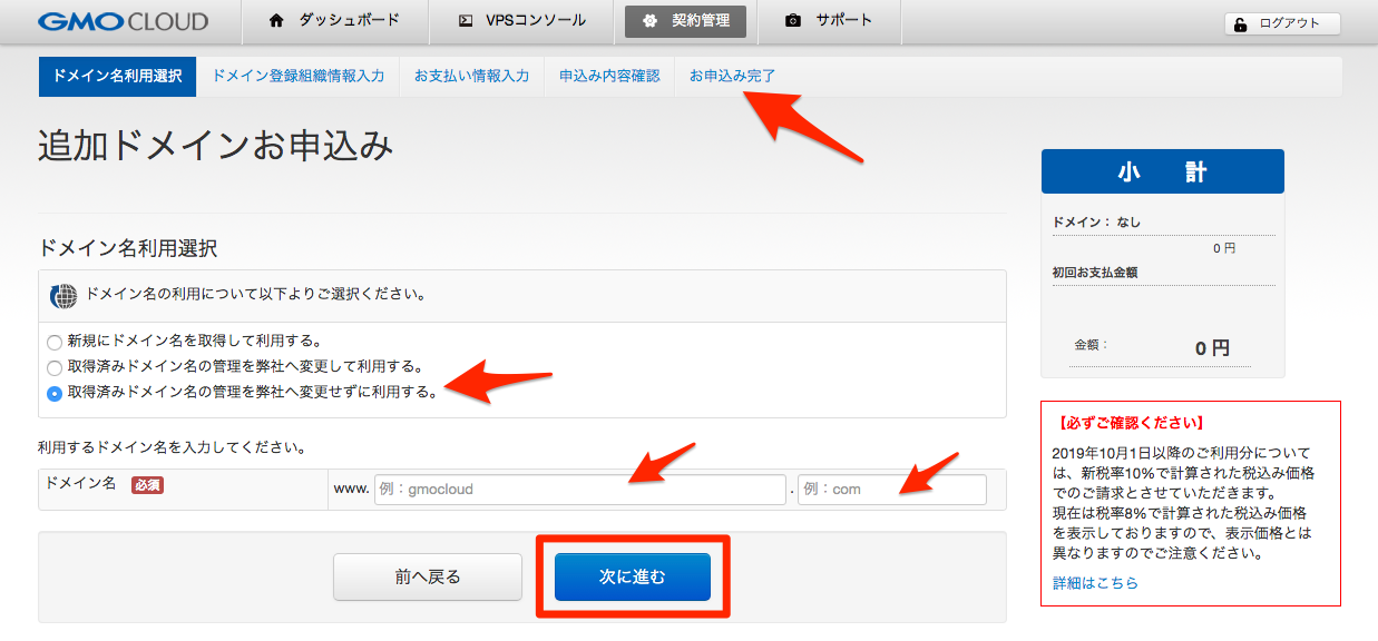 契約管理画面でドメイン名追加申し込みへ進みます。