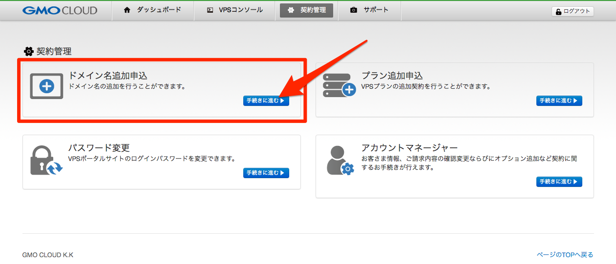 GMOのVPSサーバの場合、ドメインの設定手順は全てポータルサイトで設定を行います。