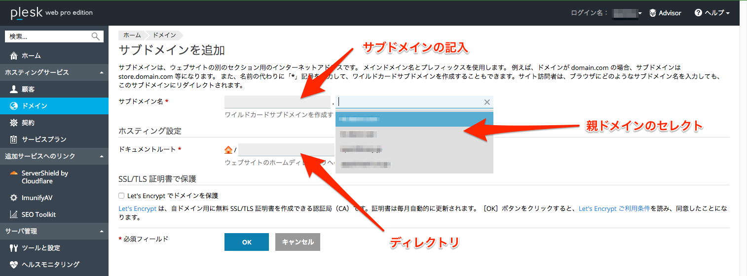 サブドメインを記入し親ドメインをセレクト、ドキュメントルートを記入して完了。