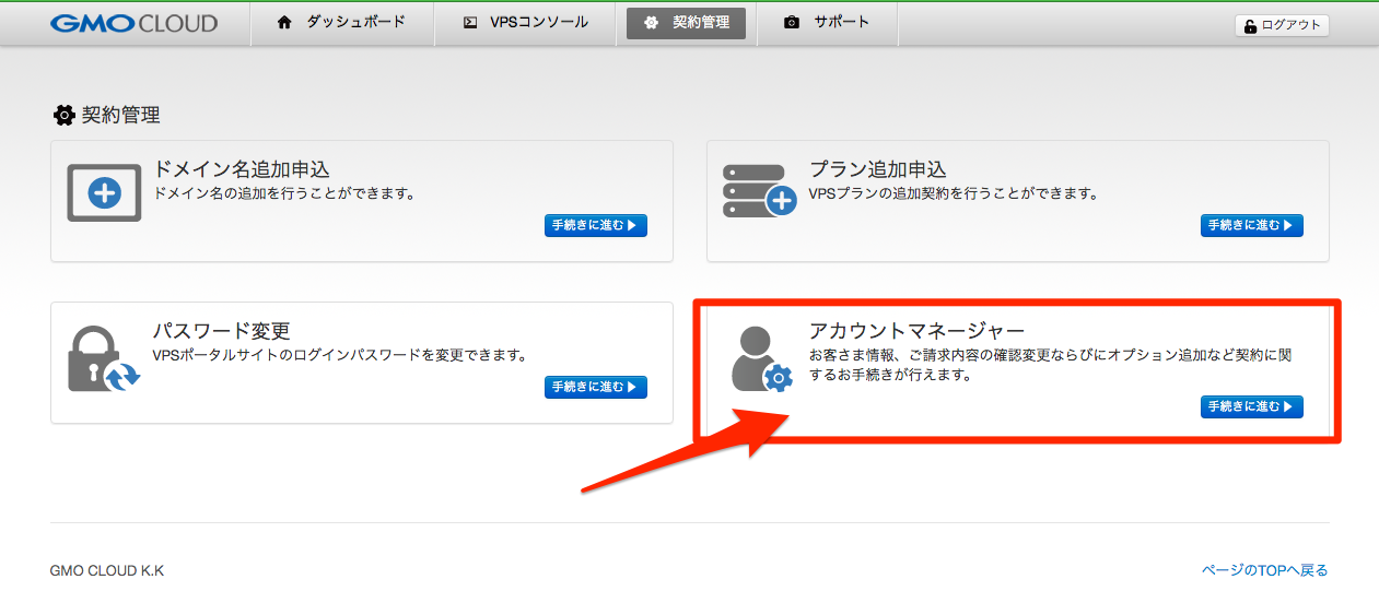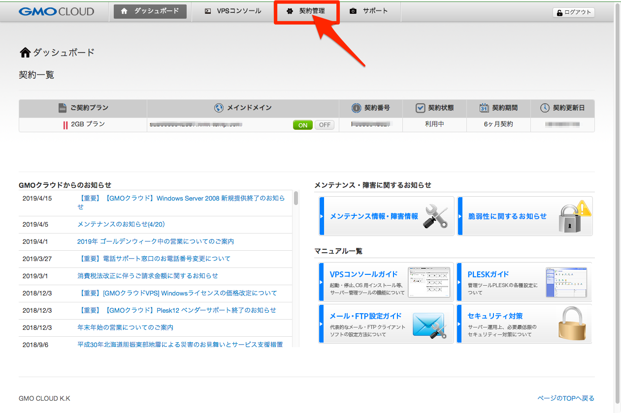 VPSポータルサイトにログイン→契約管理画面に移動してください。